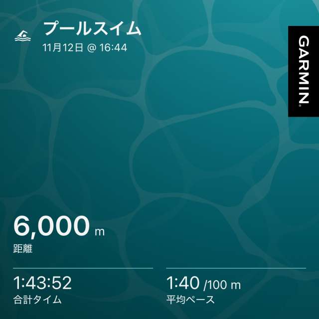 GARMIN connectでラップ数を変更できるのがわかったので120ラップに変更。100m平均1分40秒はなかなかいいラップです。バタフライも疲れず、終わっても息切れがない状態。
