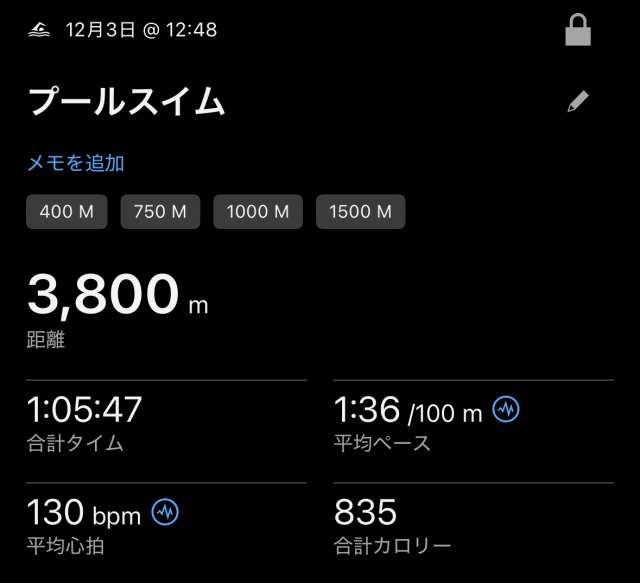 一方で気がかりなのは、右胸上部にまだわずかな痛みが残っていること。泳ぎ始めのストリームライン保持にやや違和感があります。かれこれ一ヶ月ほど続いているため、原因が掴めず気になりますが、しばらくは様子を見ながら調整していきたいと思います。
