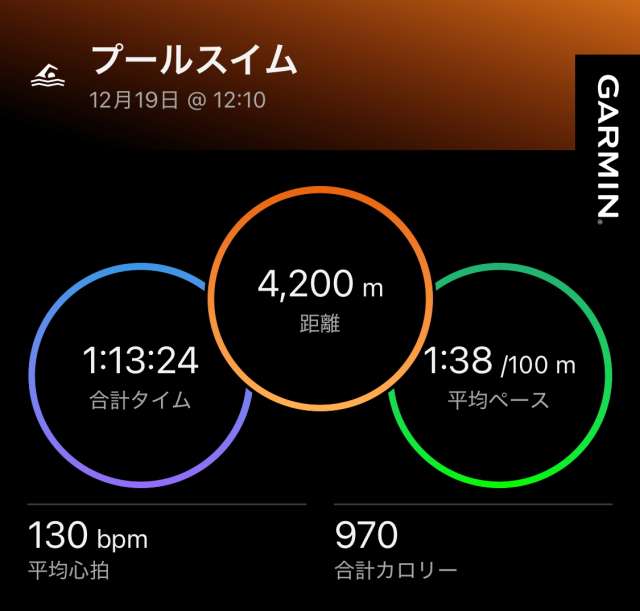 2バタでは腕が普段よりやや上がりにくい感覚はあったものの、力みを抑えることを意識し、結果として4000mを無理なく泳ぎ切ることができました。