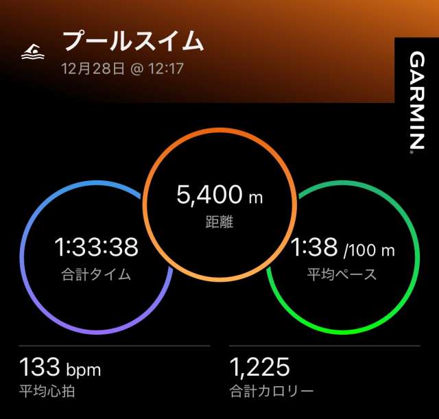 ダウンで行ったバタフライは想像以上に心地よく、結果的に4本実施。水の流れにうまく乗る感覚があり、スピード感のある泳ぎで今年の練習を締めくくることができました。